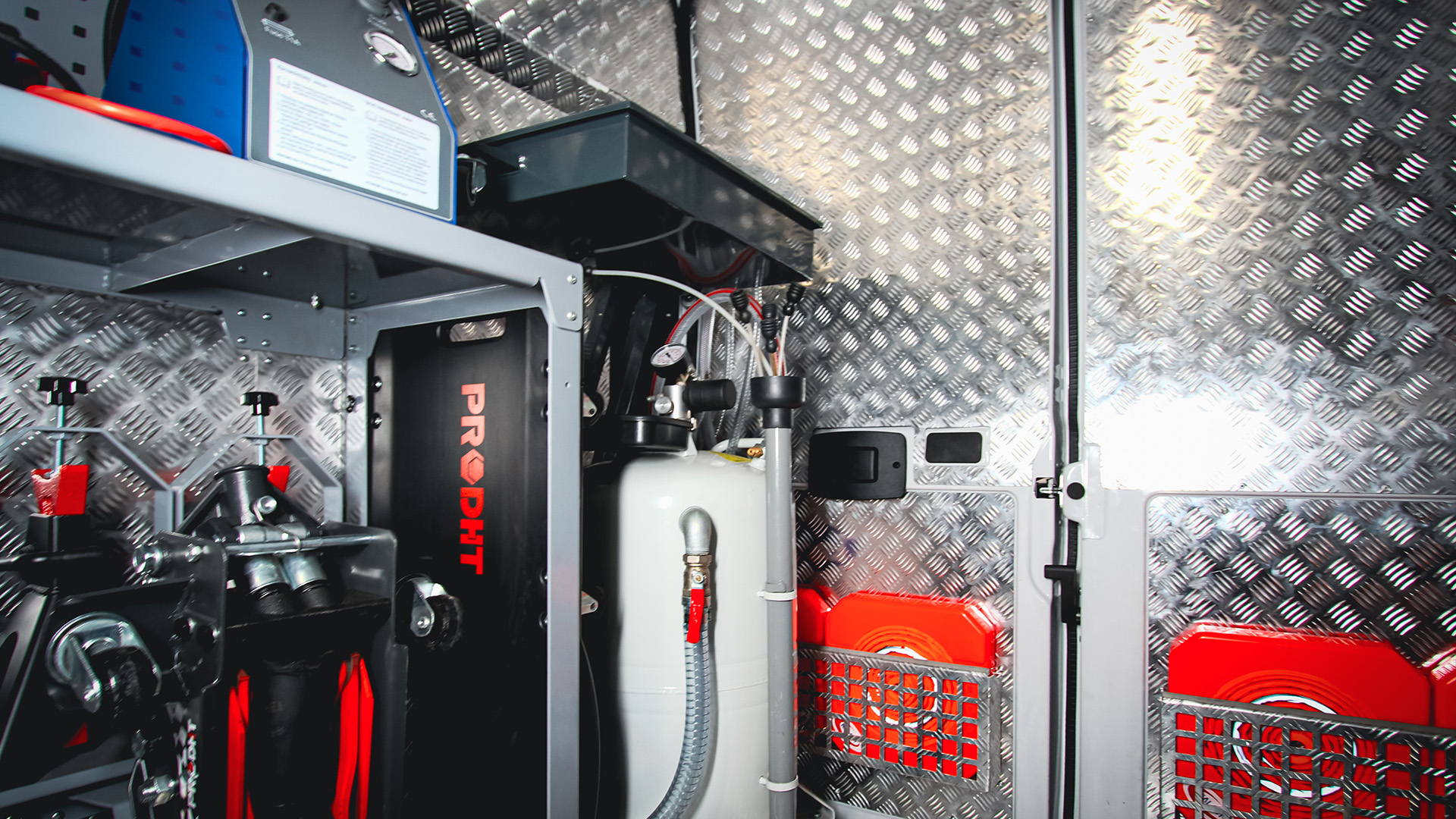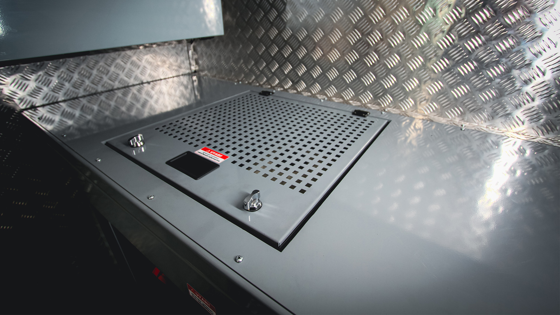 Kaymaz alüminyum zemin kaplaması, zorlu saha koşullarında güvenli çalışma imkânı sunarken; duvar ve dolap içlerine entegre ekipman sabitleme sistemleri, taşıma esnasında oluşabilecek hareket ve hasar riskini ortadan kaldırır.
