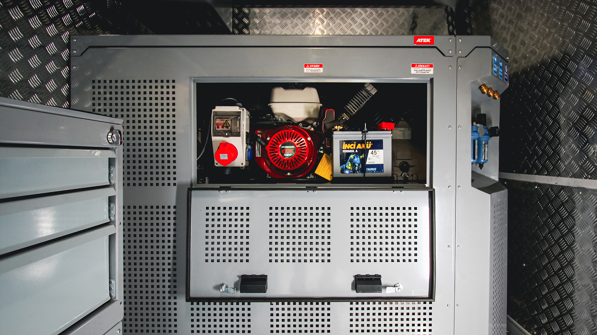Mobil servis aracı içine entegre edilen güç ünitesi; jeneratör, akü ve pnömatik bağlantıları tek bir kompakt modülde toplar. Havalandırmalı metal kabin yapısı sayesinde güvenli ve kesintisiz çalışma sağlar.