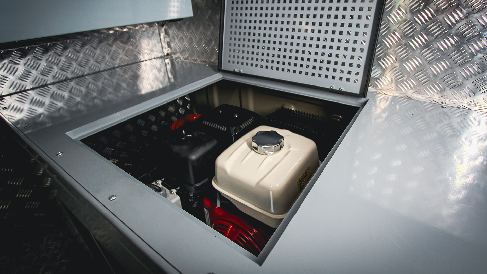 Mobil servis aracı içerisinde konumlandırılan yağ emme ünitesi, hızlı ve temiz bakım işlemleri için entegre edilmiştir. Yan panel içinde gizlenmiş tekerlekli araç altı kaydırma arabası, ihtiyaç duyulduğunda kolayca çıkarılarak araç altı müdahalelerde pratik ve güvenli çalışma imkânı sunar.