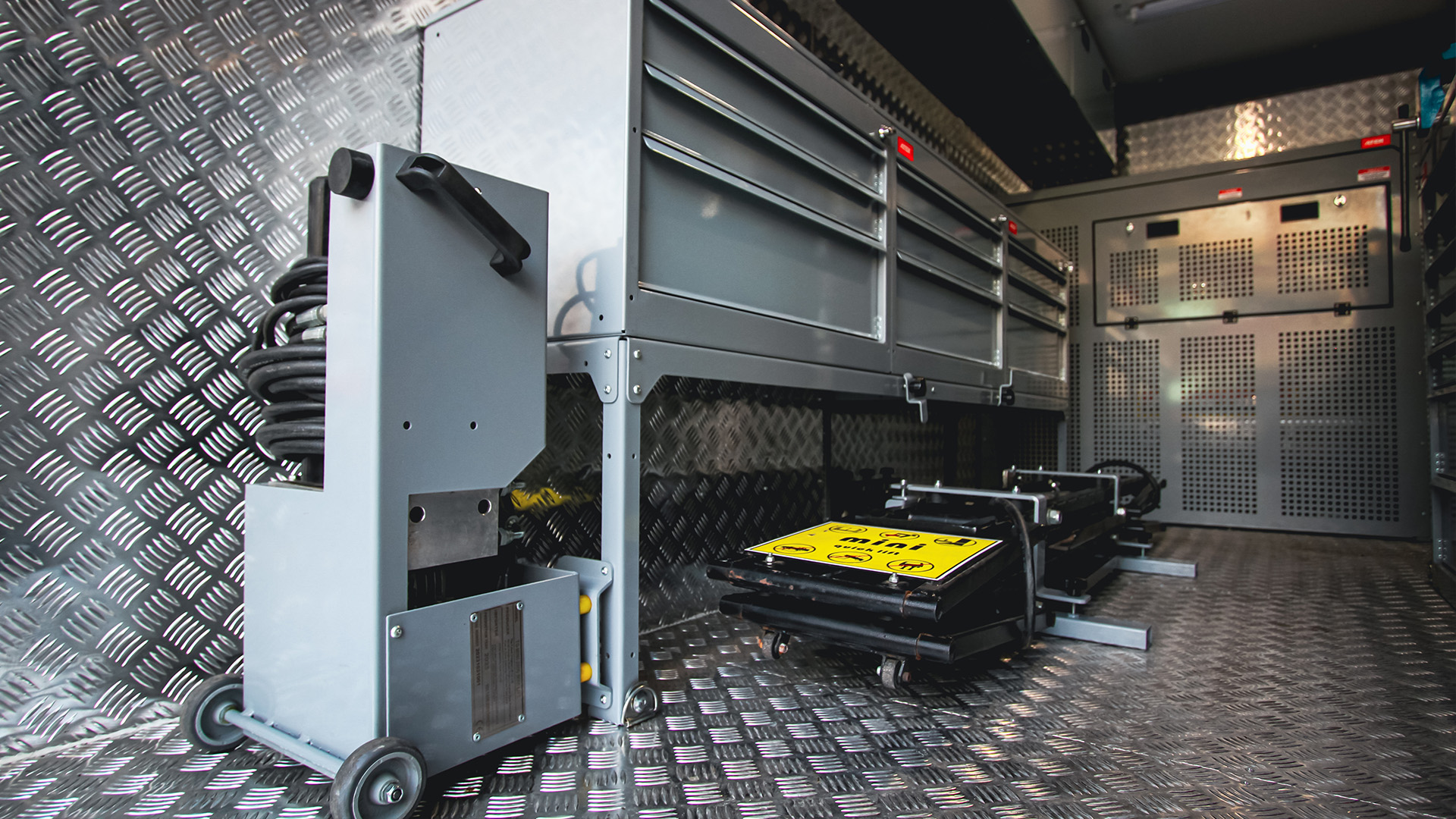 Mobil servis aracı içi yerleşim, ekipmanlara hızlı erişim ve maksimum güvenlik sağlayacak şekilde tasarlanmıştır. Arka kapıya entegre, gözler içinde gizlenmiş katlanır güvenlik kukaları, gerektiğinde hızlıca kullanıma alınarak sahada görünürlük ve güvenliği artırır. Kaymaz zemin ve sabitlenmiş modüllerle birlikte kontrollü ve verimli bir çalışma alanı sunar.